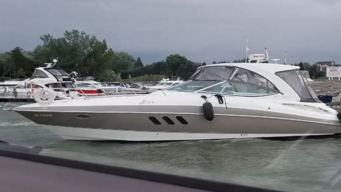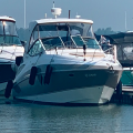 Bateau 2009 Cruisers Yachts 330 Express avec toit rigide et support pour dinghy Gala 4 places et moteur Yamaha 2,5 hp. Bateau très spacieux avec beaucoup de rangement. Bow thruster avant, radar Raymarine GPS, Vessel, 2 réfrigérateurs, 2 TV (intérieur et extérieur) génératrice, BBQ fixe sur une plate-forme, lumières sous l'eau LED bleues. Longueur intérieure: 35 pieds Longueur hors-tout: 37 pieds Largeur: 11,8 pieds Moteurs: 2 Mercruiser 6.2