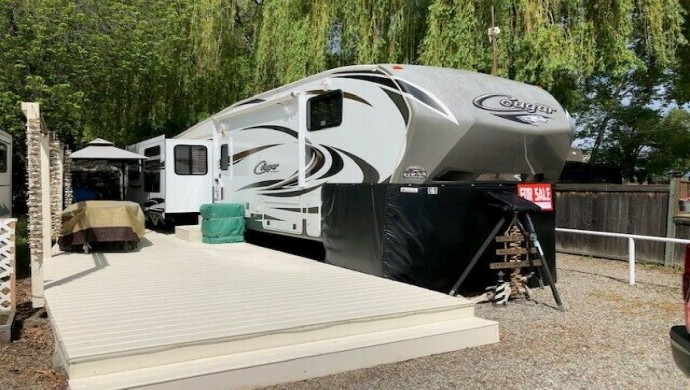 For Sale 2013 Keystone Cougar 5th wheel 333 MKS 36 FT Located on quite RV pad in Summerland, BC. Unit#C-01 3919 Landry Crescent. Like New Very Clean. Price includes Deck, Sun Shade Canopy, Bbq Canopy, Small Outside Fridge, Privacy Roll Up Shades, Outside Window Covers & Shed. Includes Boat Anchor Tie Out. Pad rental approximately $500+/Per Month. Asking $54,950.00.