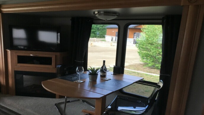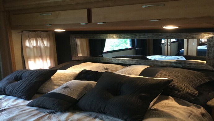 Faut voir, décoration au goût du jour,( plancher Et dosseret cuisine et salle de bain refait). Comme neuf intérieur et extérieur. 69000 km longue route (Floride, Californie, ouest canadien) , freins neufs, batterie neuve , hydraulique changé en 2017. Ballons suspensions, laveuse, secheuse, 2 TVs et bien plus. Cire et scellant a peinture fait a chaque printemps. Jamais vu l’hiver. Aucune infiltration d’eau. A voir !!!