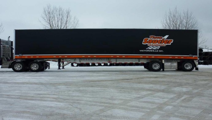 Remorque Reitnouer aluminium 48' X 102'', 2 essieux dont une relevable à l'air. Freins à disques. Pneus 445 / 50 / 22. Un coffre à blocs. Toile rétractable Chameleon. Espace intérieur 102'' X 102'' X 48'. prix $ 35,000 - Pour plus de renseignements, demander :